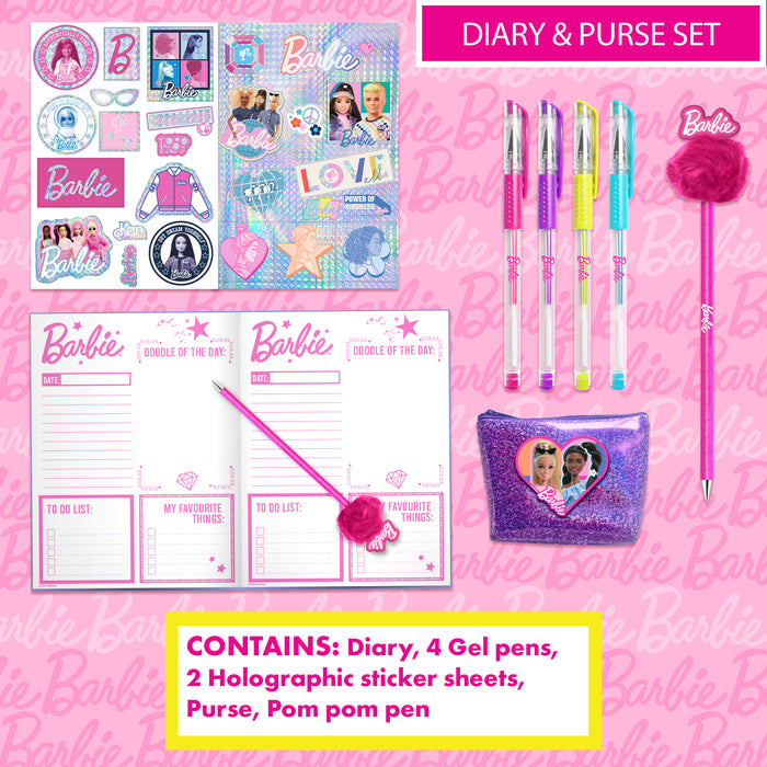 Unlock The Magic Of Imagination With The Enchanting Barbie Diary And Purse Set! This Delightful Set Includes A Beautifully Designed Diary For All Your Secret Thoughts And Dreams, Along With Two Holographic Sticker Sheets To Personalize Every Page. Express Your Creativity With Four Vibrant Gel Pens, Each Adding A Splash Of Colour To Your Writing And Drawings. The Chic Purse Is Perfect For Carrying Small Essentials And Adds A Touch Of Barbie Flair To Any Outfit. And Don't Forget The Adorable Pom Pom Pen, Making Every Jot And Doodle Extra Fun. Perfect For Any Barbie Fan, This Set Is A Must-have For Stylish Storytelling.
