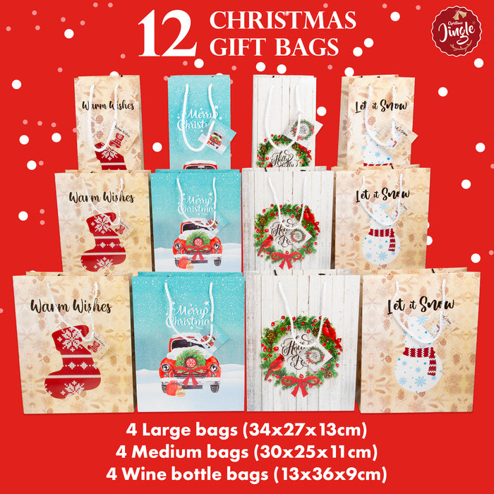 Gift Bags Christmas Multipack - Set Of 12 Christmas Gift Bags Multipack - In 3 Different Sizes And A Range Of Christmas Designs. Includes Rope Handles And Matching Gift Tag