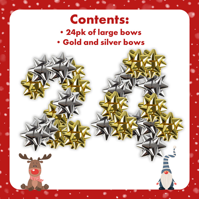 Celebrate every occasion with our exquisite 24-Pack of Large Silver and Gold Bows! Elevate your gift-giving experience and add a touch of elegance to your presents with these beautifully crafted bows. Whether it's birthdays, weddings, or festive holidays, these bows are the perfect finishing touch to make your gifts truly stand out.