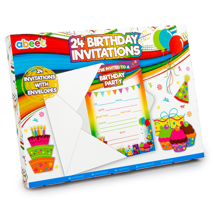abeec® party bag fillers. 24 Birthday invitations. These rainbow party invites are perfect for a kids birthday party. Comes in a 24 pack to invite all of your friends and family! The beautiful party design will catch everyones attention!