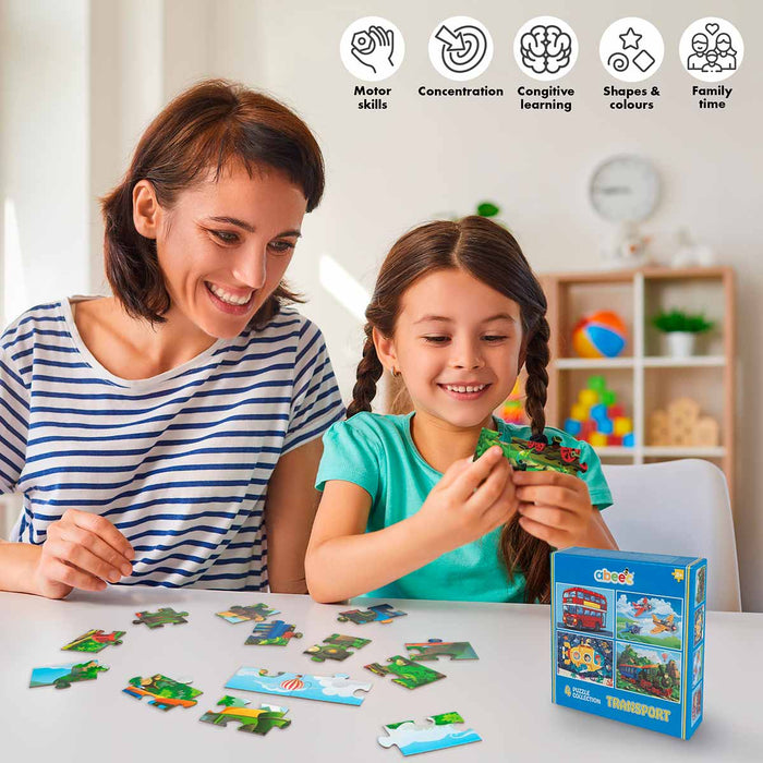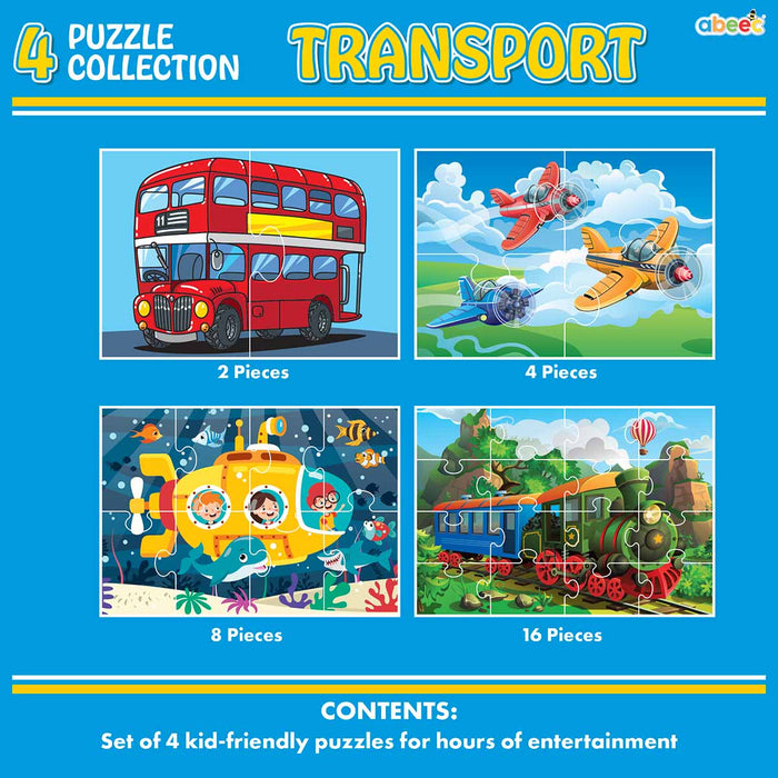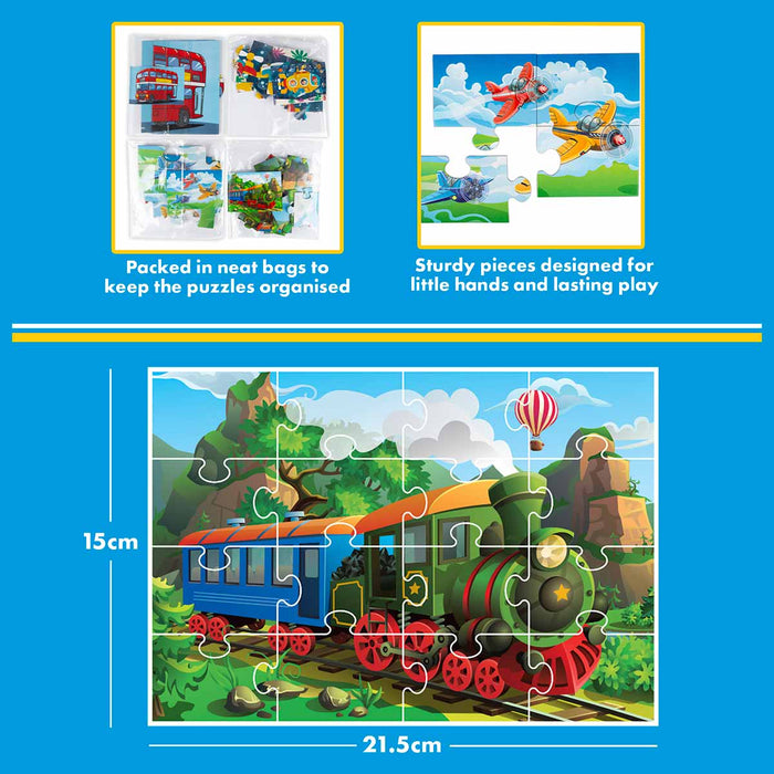 Introduce Your Little One To The Joy Of Puzzles With This Vibrant 4-piece Collection! Featuring Themes Like A Bus, Planes, Submarine, And A Train Scene, Each Puzzle Grows In Difficulty From 2 To 16 Pieces. Perfectly Sized At 21.5cm X 15cm, These Durable, Colourful Puzzles Inspire Learning And Fun!