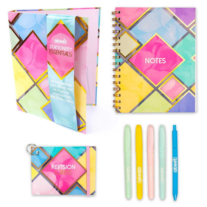 Introducing our dreamy Pastel and Gold Geometric Design Stationery Set, where elegance meets creativity. Inside this magical set, you'll find a variety of beautifully coordinated stationery essentials. From notebooks to notecards, sticky notes to pens, this collection has everything you need to add a touch of enchantment to your desk or workspace. Not only is this set perfect for personal use, but it also makes an exquisite gift for that special someone who appreciates the finer things in life. Whether it's a birthday, graduation, or just a thoughtful gesture, the Pastel and Gold Geometric Design Stationery Set is sure to impress and delight.