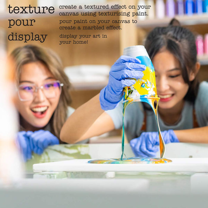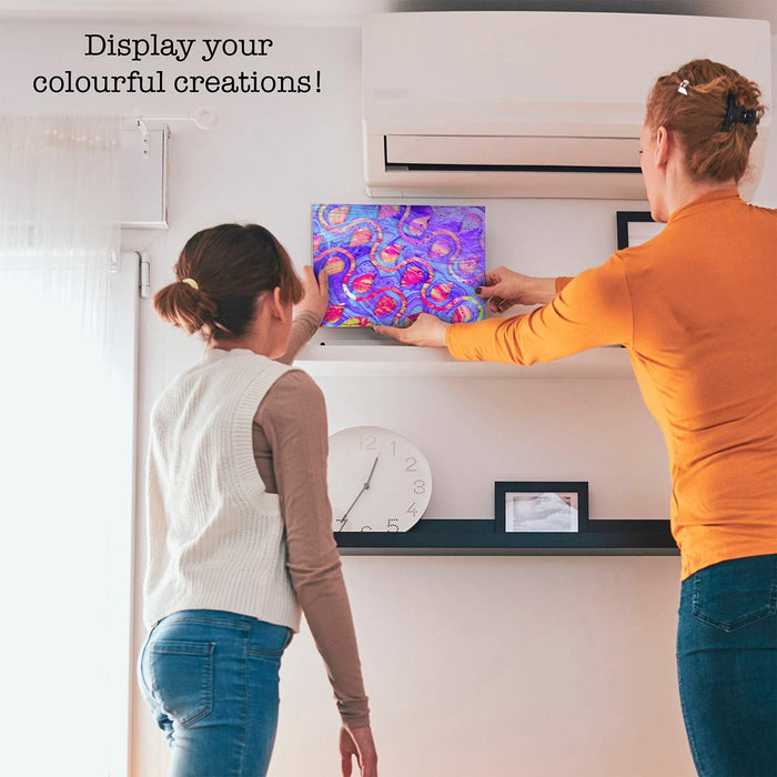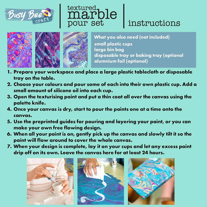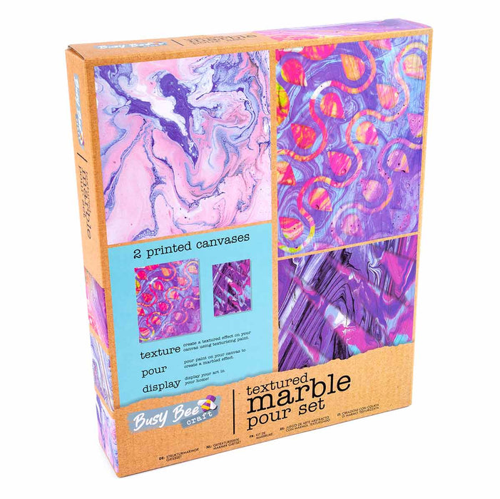 Dive into the mesmerizing world of fluid art with our Textured Marble Pour Set. The comprehensive kit equips you with everything you need to create captivating marbled designs. With two pre-printed canvases, vibrant acrylic paints, texturizing paint, silicone oil, and all the necessary tools, you can bring your artistic vision to life with ease. Whether you’re a seasoned artist or just starting out, the step-by-step instructions make it simple to experiment with colour blending and unique marble effects. Perfect for crafting stunning masterpieces or enjoying a creative, mess-free project with friends, this set offers endless possibilities and hours of fun. Let your imagination flow and create something truly one-of-a-kind!