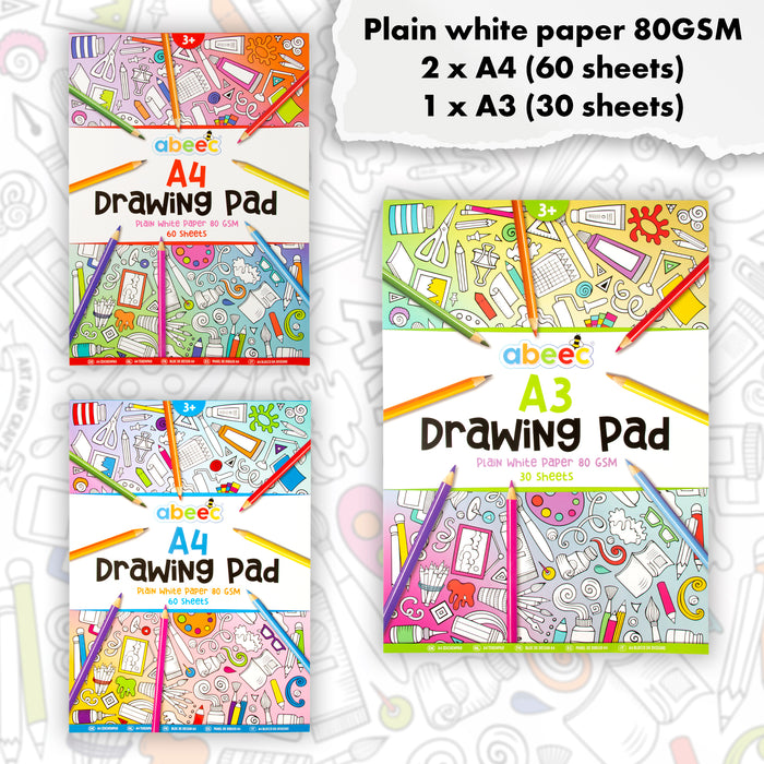 1 x 3 Pack Drawing Pads for Children - 2 x A4 Plain Sketch Pads, 1 x A3 Plain