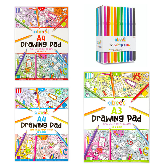 With three colouring books in a pack, these Children's Drawing Pads are perfect for little artists. The Pack contains 2 x A4 drawing pad and 1 x A3 sketchbooks, one for bigger projects and one perfect for keepings kids occupied on long journeys. This awesome set of white drawing paper, is useful for all the family. Perfect for a kids easel and with A total of 150 sheets over the 3 junior artist sketch pads, the creativity will never stop. These pads can be used for colouring, sketching, painting, scrapbooking and even finger painting.