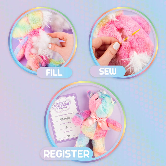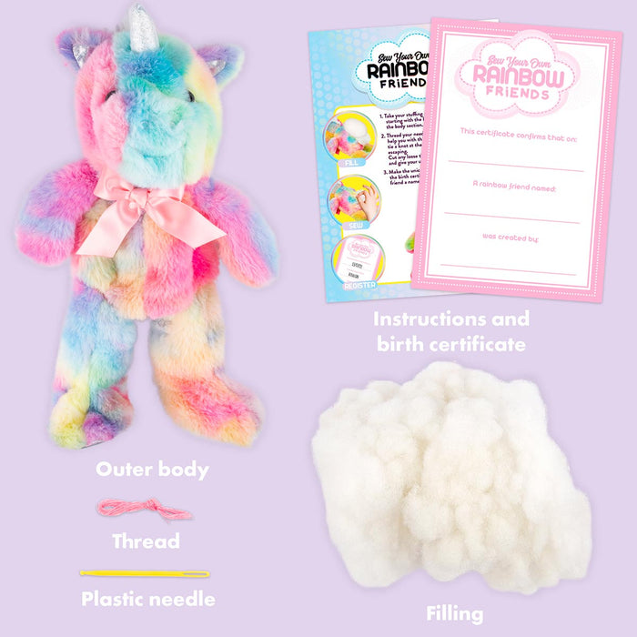 Get ready to add a magical touch to your child's creativity with our Sew Your Own Rainbow Unicorn Set! This enchanting set contains everything your little one needs to create their very own plush unicorn toy, with easy-to-follow instructions that make creating your own teddy a breeze. Not only does this set encourage creativity and imagination, but it also helps develop important skills such as patience and hand-eye coordination. Once you've completed the cute unicorn teddy, fill out their birth certificate with a new name for your unicorn friend.