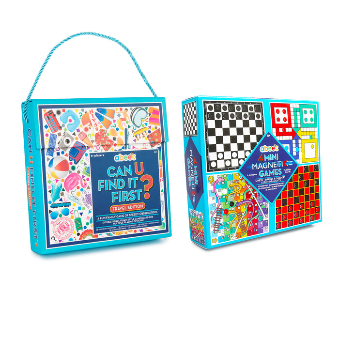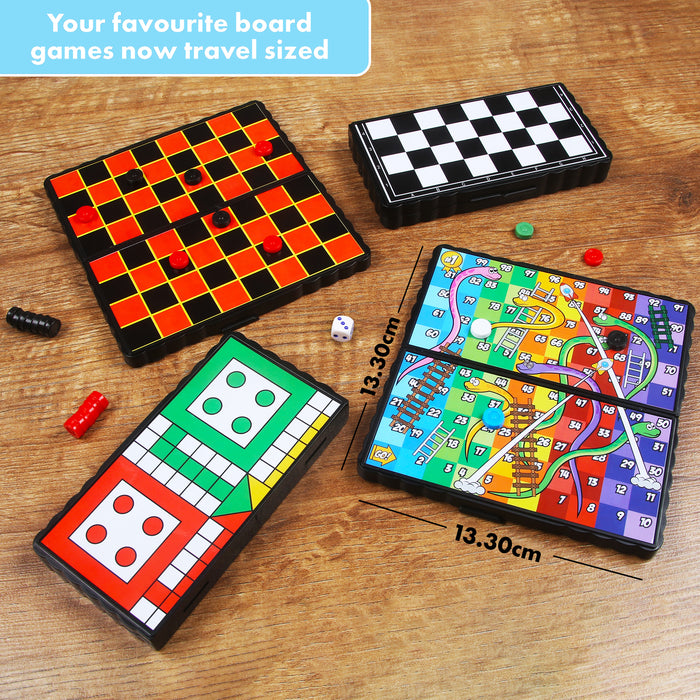 4 pack of mini magnetic games | abeec® toys travel games. This 4 pack of travel games offer 4 of your favourite traditional board games in mini magnetic versions perfect for travelling. The magnetic board games fold away easily, perfect for on the move and travelling. Magnetic counters ensure everything stays attached to the magnetic game boards! Classic travel games include: Chess, Snakes & Ladders, Ludo, & Draughts.